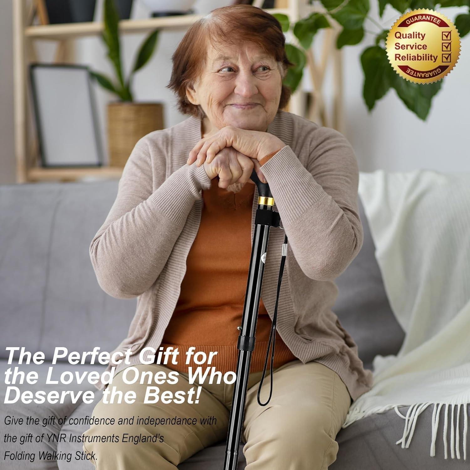 YNR Adjustable Folding Walking Stick – Lightweight Foldable Cane with Pivot Tip, 5-Level Height, 120kg Support, Ergo Grip Mobility Aid (Black, 0.5kg)