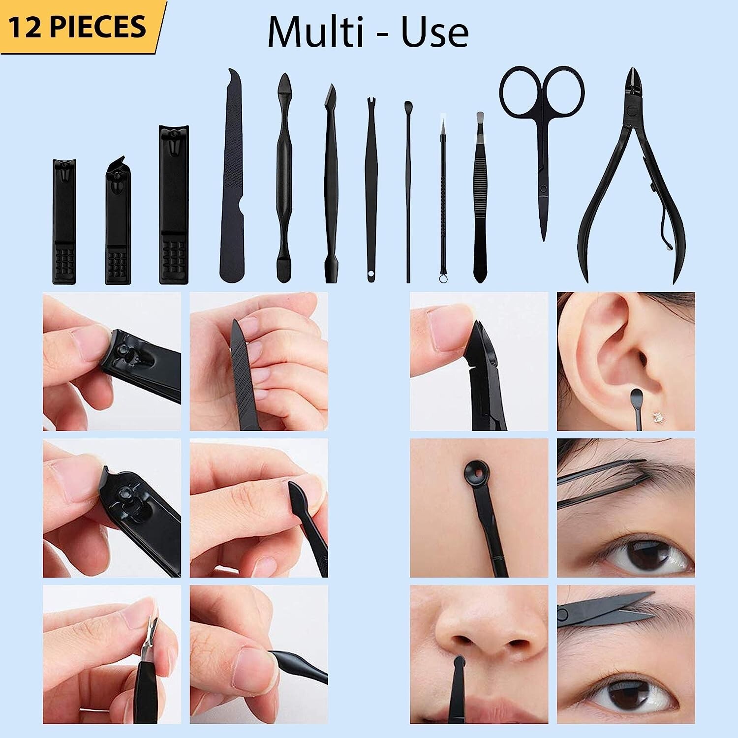 • Unisex Gift: Nail care tools are suitable for women and men. This is a perfect gift or daily surprise gift to your families and friends. Package Includes 2x Nail Clippers, 1x toenail Clipper, 1x Cuticle Trimmer, 1x Tweezer for removing unwanted hair, 1x Pair of Beauty scissors for eyebrow trimming, 1x Nail File, 1x Single-edged double-sided push stick, 1x V-Shaped push stick, 1x Ear pick, 1x Needle for removing acne, 1x epidermis trimmer with this makes the manicure set to professional tweezers